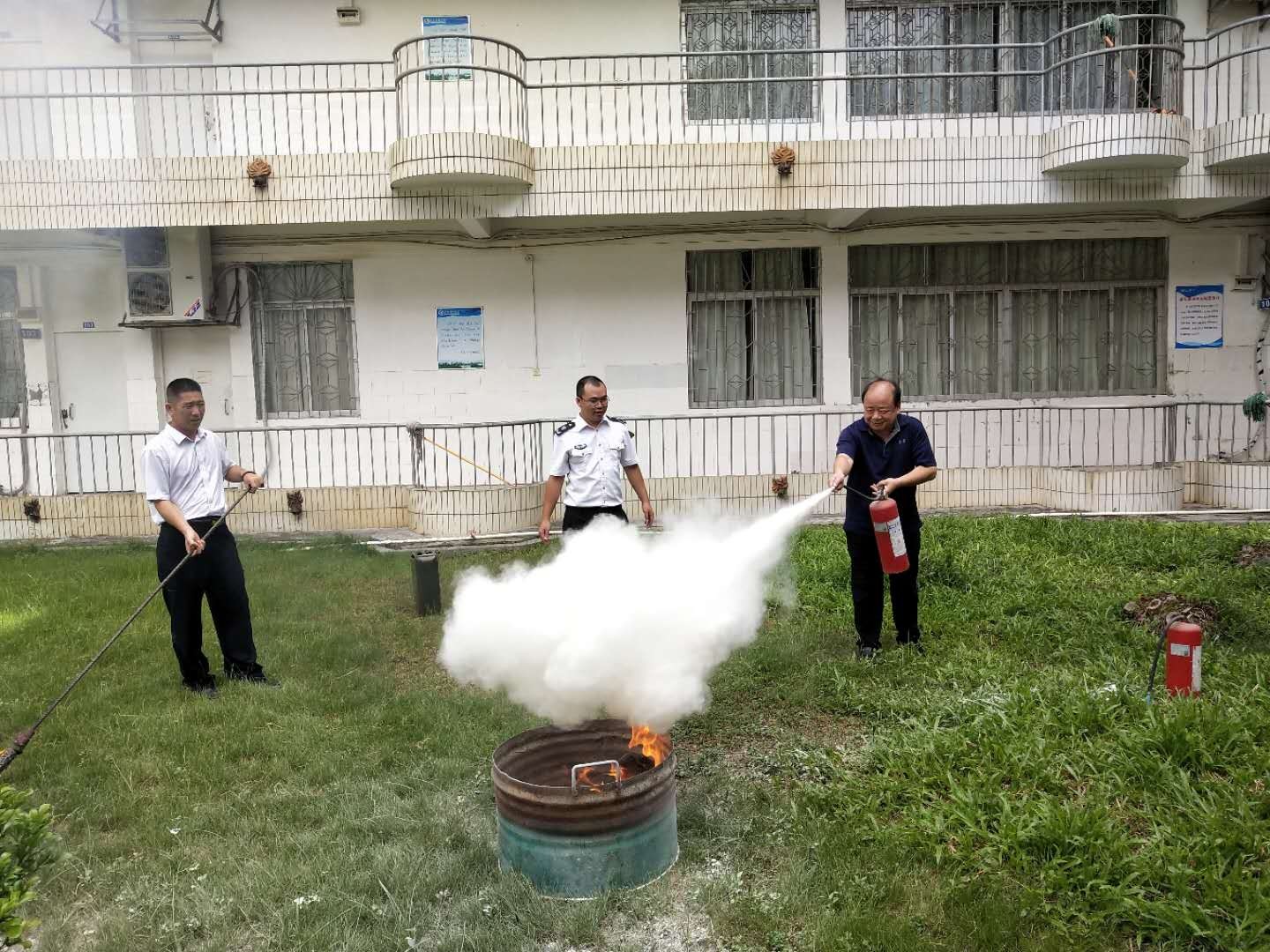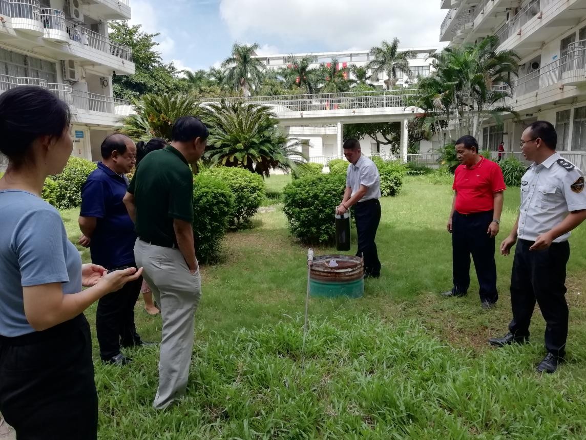 培训结束后,进行了消防演练。教官演示了灭火器的操作程序、使用步骤及运用技巧,语言实训中心全体人员在教官的指导下使用灭火器对“初级火灾”进行了灭火操作演练。