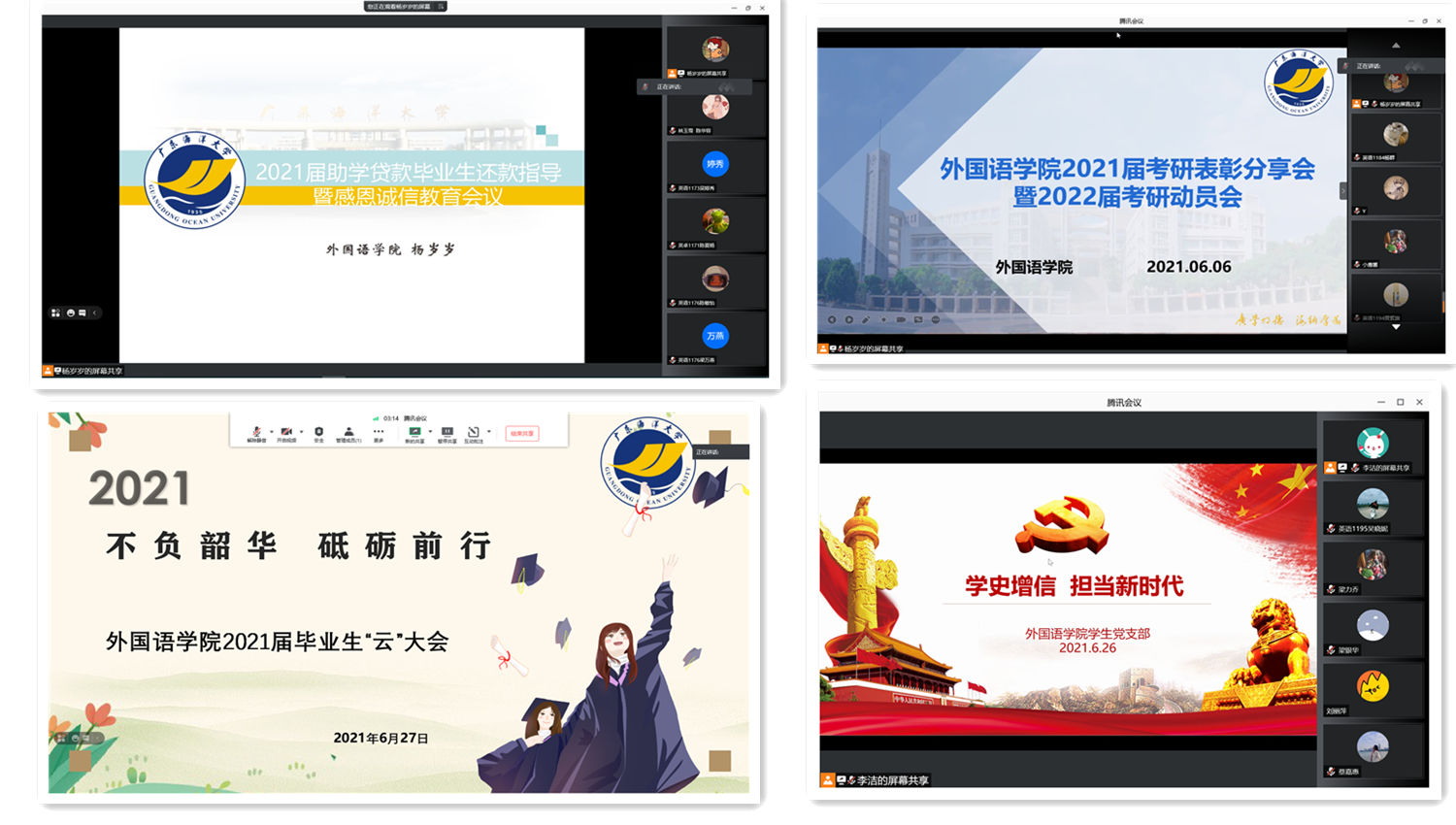 6月5日,学院通过腾讯会议平台开展2021届考研优秀学子经验分享暨2022届考研动员会。分享会上,6位2021届考研上岸学子围绕英语、日语专业考研复习攻略、调剂注意事项、留学等方面向低年级同学分享经验与心得,为大家提供考研复习、面试技巧以及留学申请等方面的经验与指导。