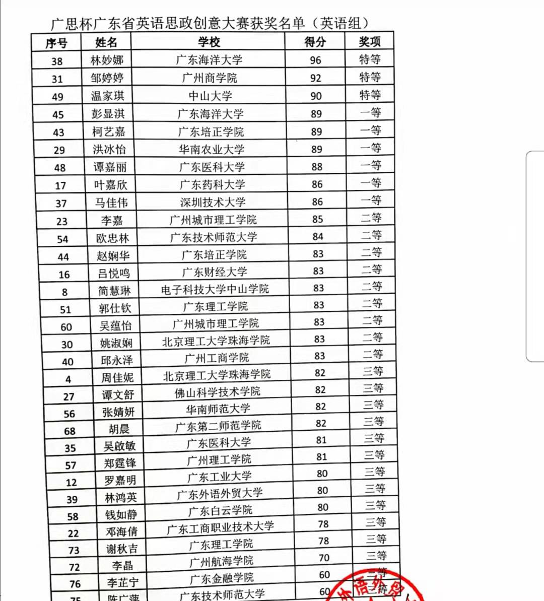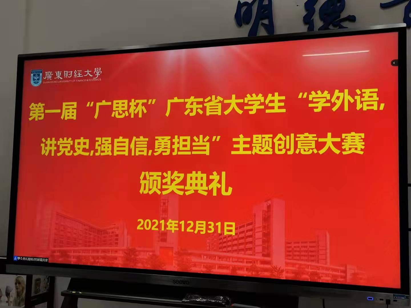 12月31日,首届“广思杯”广东省大学生“学外语,讲党史,强自信,勇担当”主题创意大赛决赛在广东财经大学广州校区圆满落下帷幕。本次大赛从初赛到决赛历时39天,全省共有37所高校的30821名学生参加初赛,35所高校的81名选手入围决赛。经过激烈角逐,决赛共评选出英语专业组特等奖3名,一等奖6名,二等奖9名,三等奖14名;非英语专业组特等奖4名,一等奖9名,二等奖13名,三等奖19名。我校有9717名学生参加初赛,参赛人数名列全省第一。在决赛中我校学生林妙娜以排名第一的成绩荣获英语专业组特等奖,彭显淇同学以排名第四的成绩荣获英语专业组一等奖,黄嘉茵同学荣获非英语专业组三等奖。我校WilliamHill威廉院长郭遂红应邀担任决赛评委。同时,我校因比赛组织有力、成绩突出而荣获“优秀组织奖”。