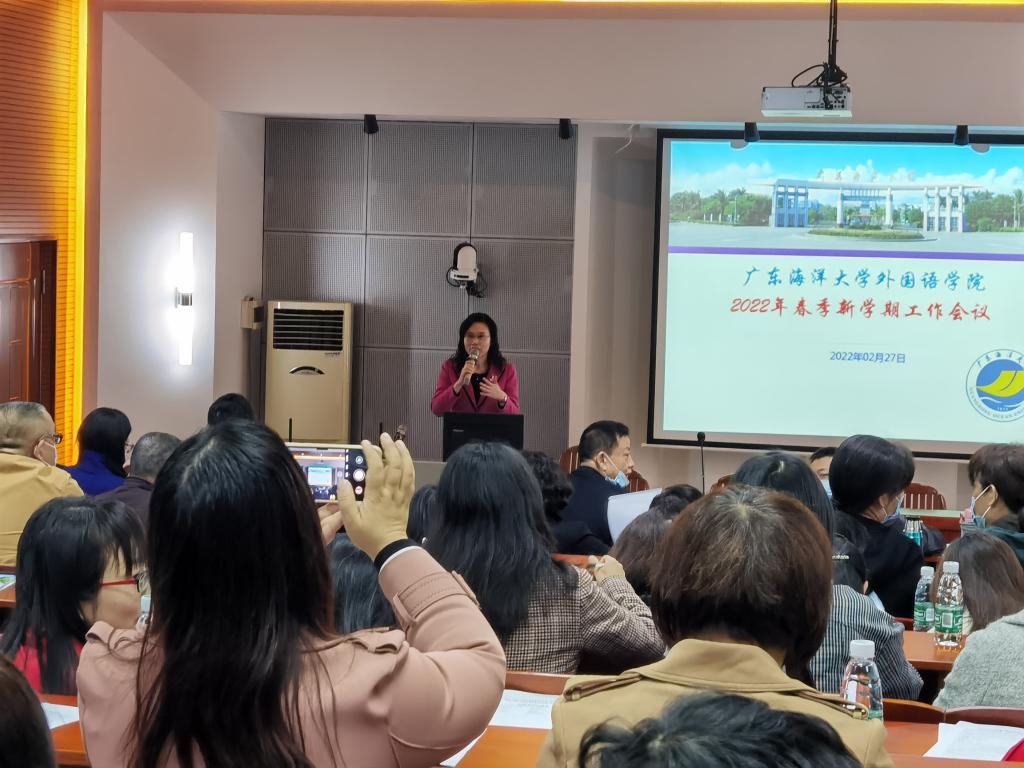 郭遂红对WilliamHill威廉2021年的教学、科研、师资队伍、人才培养、党建、学生工作等进行了全面的总结,传达了学校的重点工作,并就学院新学期工作要点及学校近期有关通知注意事项进行了部署要求。她强调:一是落实立德树人根本任务,强化组织建设深入推进“头雁”工程,落实意识形态工作,加强师德师风教育。二是加强省级一流专业建设,以及思政示范专业建设和课程建设。强化基层教学组织建设,加强教研教改。三是加强师资队伍建设,内培外引,组建教学(科研)团队,加大对青年教师的培养力度和考核力度。对标学校人事制度改革3.0版,进一步完善教师业绩考核制度。四是加强科研与学科建设,培育高层次项目、论著与科研奖项,加强涉海外语研究,凸显海洋大学外语学科特色。五是加强实习基地、跨境电商产业学院建设,加大语音室及实验教学平台的建设力度。六是推进学生工作,构建一核四翼两结合的外语专业实践育人模式,推进双创工作及学科竞赛,全力推进三全育人项目实施。七是以学科竞赛体系、外语文化艺术节、英语社团为抓手,丰富外语第二课堂。八是以“三定”方案为契机,建章立制,规范管理,切实加强系、部建设,发挥教学基层单位的教学中心作用。