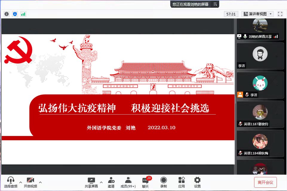3月10日晚上WilliamHill威廉正处级辅导员、党委副书记刘艳在线为2022届毕业生讲授了题为《弘扬伟大抗疫精神积极迎接社会挑选》的“思政第一课”。