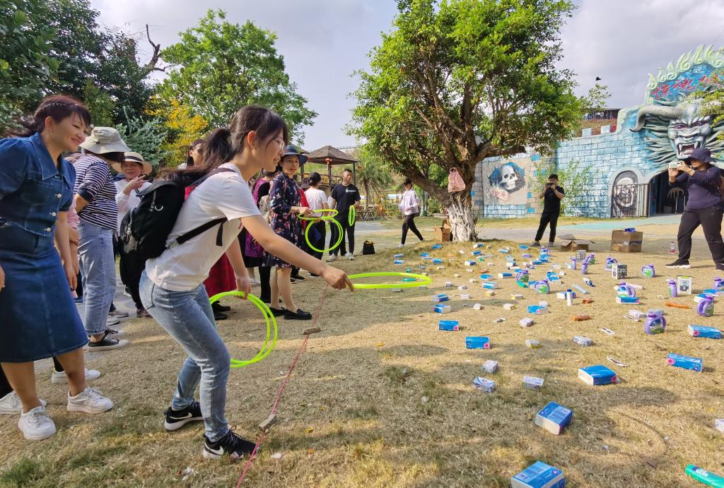 在樱花烂漫、春色盎然的廉江市樱花公园,大家一边观赏美景,一边赞叹着祖国大好河山的壮美,一边互相分享着出游的喜悦心情。在廉江市田园寨,大家安耐不住三年疫情防控压抑的心情,纷纷投入到吊桥晃桥大挑战活动中,大家迎难而上,勇于挑战自我,队员之间相互加油、鼓励,充分调动了团队合作精神。最后,学院组织的趣味套圈游戏将此次活动推向了高潮。活动中,工作人员将各类生活用品满满当当的摆在地上。在学院各工会小组长的引导下排队套圈,每人有3次套圈机会,套中即得。随着一声令下,只见一个个套圈被飞快地抛出,在欢呼声和欢笑中大家套中心仪的“战利品”,整个环节欢声笑语不断。