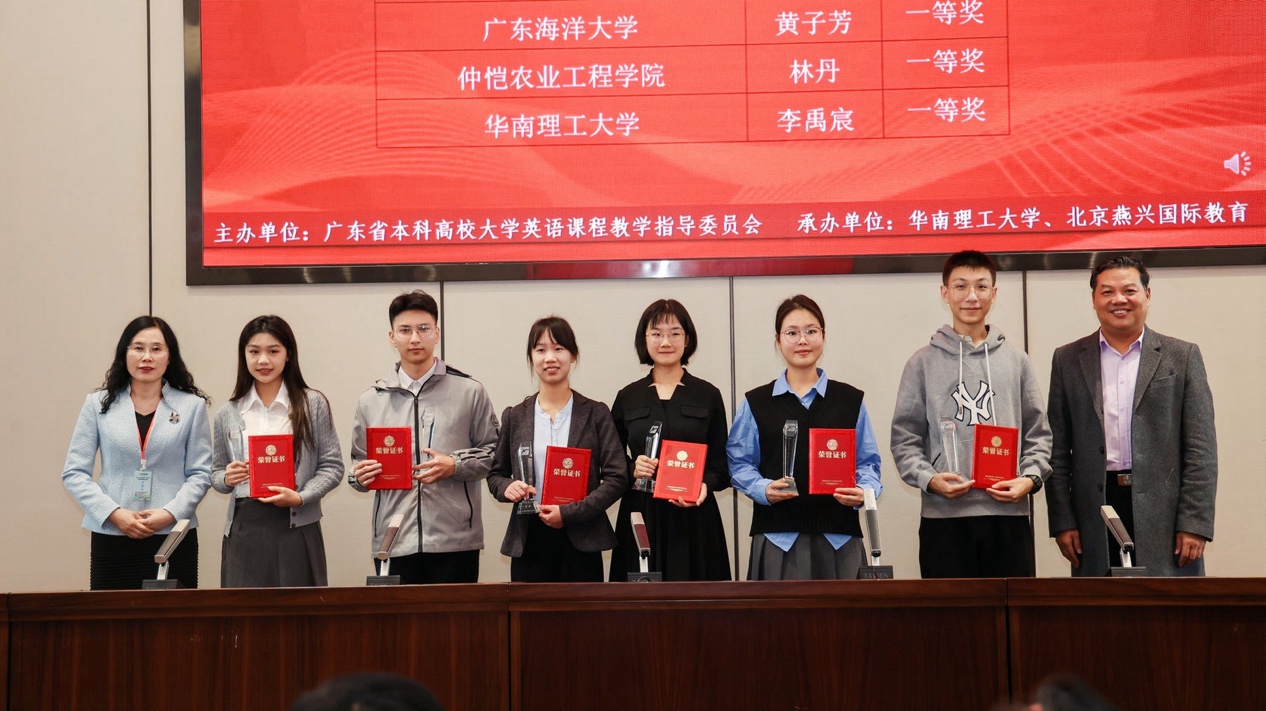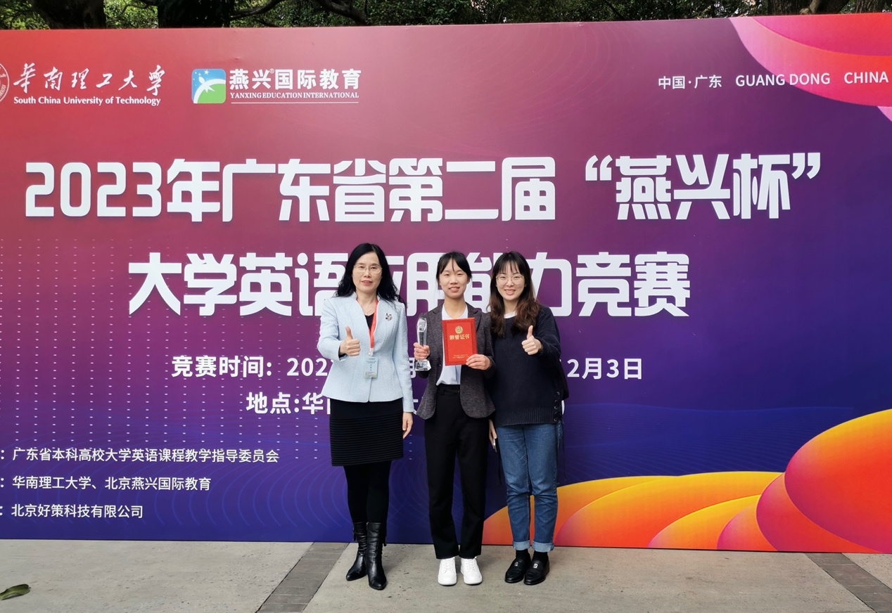 2023年12月3日至12月4日,广东省第二届“燕兴杯”大学英语应用能力竞赛复赛及决赛在华南理工大学顺利举行,我校选手取得优异成绩,斩获一等奖1名,二等奖3名,三等奖5名。