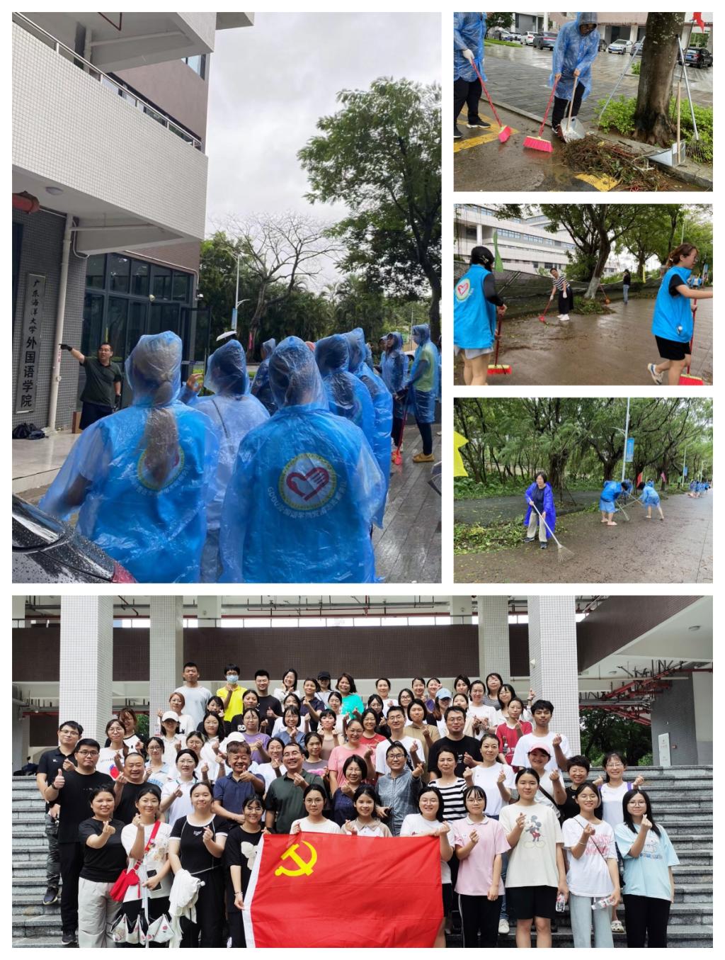 学院刘艳书记、金志茹院长带领志愿者承担了学校外环部分主干道及周边楼宇的清扫任务。所有参与者众志成城,齐心协力,互相配合,搬移树木断枝,清扫落叶杂物,汗水与雨水交织在一起,很快片片散落的树叶、树干被聚拢在路边,静静的等待被运走,短时间内让所负责区域恢复了干净整洁。志愿者们积极响应学校号召,为重现校园之美无私奉献。