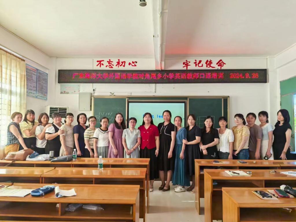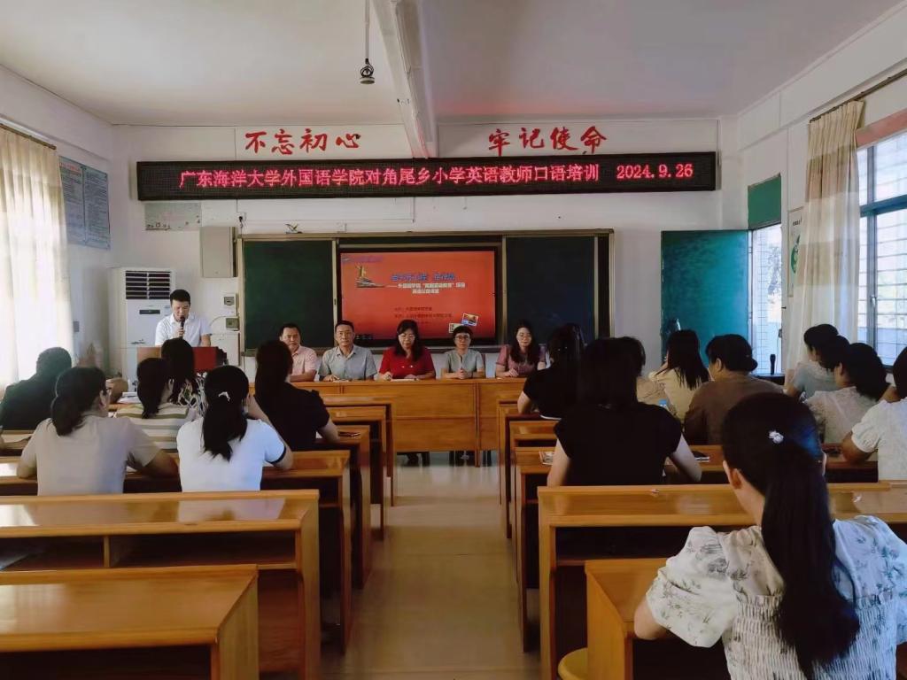 秉持“进一步贯彻落实英语教学新课标”理念,为全面提升徐闻县角尾乡小学英语教师教研能力,充分发挥名校、名师的示范引领作用,加强对帮扶学校的交流和指导,推动教育均衡发展,促进优势互补、资源共享,切实提高当地英语教师教学水平,2024年9月26日,学院党委指派公共外语教学研究部党支部书记、公外部主任陈松和骨干教师黎晖赴徐闻县角尾乡中心小学为基层一线的英语教师开展融“素养+技能+创新”三位一体的立体式英语教师口语培训第一课,重点聚焦乡镇小学英语教师语音能力提升的迫切需求,量身定制课堂,培训过程师生积极互动,教学成效明显。后续,外院师资培训团队还将就教学能力、课程设计、论文撰写、职称晋升等方面为角尾乡中小学英语教师提供“1+N”教研专项辅导,以期通过外语专业教学能力培训,赋能乡村教育活力提升。徐闻县教育发展中心董晓芳主任和袁小霞老师,角尾中心小学黄奋才书记、翁妃文校长、陈朝柏副校长、学校教导处所有正副主任以及全乡17位英语教师参加了此次培训活动。