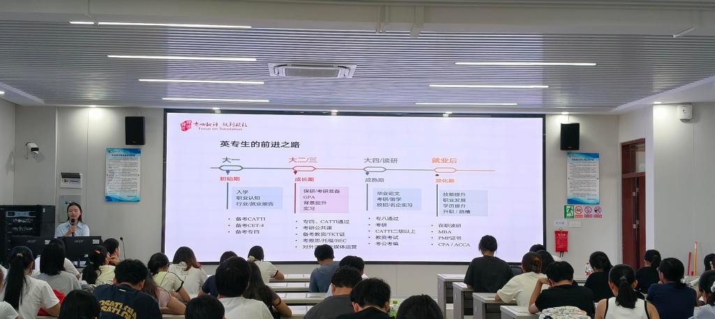 讲座中,尹周锐以行业前沿视角,围绕“AI数字+时代的语言服务”“外语er的就业黄金赛道”“人才模型与职业发展建议”三大核心板块展开深度分享,为在场学生搭建起行业认知与职业规划的桥梁。