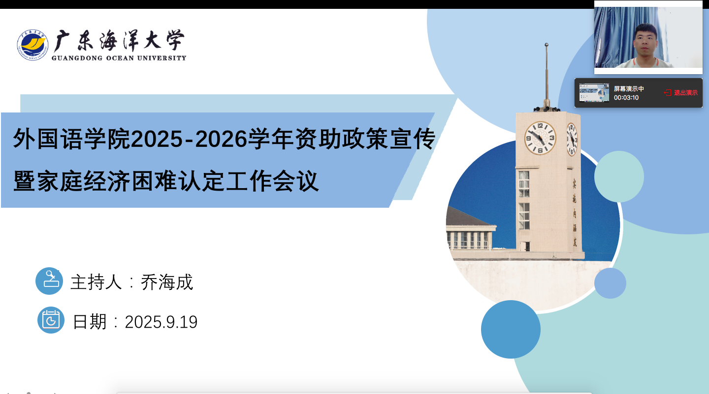 在2025年秋季困难生认定工作部署中,乔老师从“精准认定、规范流程、保护隐私”三方面说明:认定对象为学院全日制在读困难学生,分特别困难、困难、一般困难三档;明确“学生申请—班级评议—学院审核—公示确认”流程,确保公平公正,并要求学生于9月22日前通过“智慧学工”系统提交申请及材料。