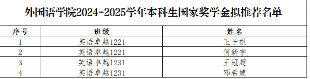 根据《2025年全日制本科生国家奖助学金工作安排》,按照《威廉中国全日制本科生国家奖助学金实施办法》(校学生〔2024〕14号)要求,我院开展国家奖学金评选工作。结合学校名额分配,经学生本人申请、学院审核及讨论,评选出国家奖学金4人,现将WilliamHill威廉2024-2025学年本科生国家奖学金拟推荐名单进行公示。