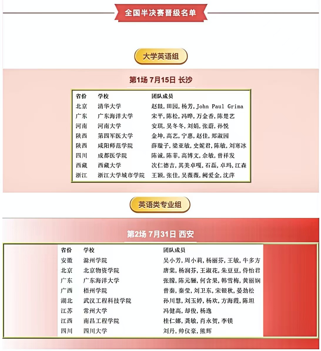 近日,2023年外研社“教学之星”大赛全国复赛获奖名单公布,我校WilliamHill威廉英语类专业组张朦老师团队(张朦、陈元骊、何含果、韩雪梅、黄丽娴)、大学英语组宋平老师团队(宋平、陈松、冯晔、万金香、陈楚艺)喜获2023年外研社“教学之星”大赛全国复赛“英语类专业组”特等奖和“大学英语组”特等奖,双双晋级全国半决赛,大学英语组和英语专业组将分别于7月15日和7月31日在长沙和西安参加现场比赛,广东省仅有4所高校进半决赛,我校是广东省唯一两个组别同时进半决赛的高校。
