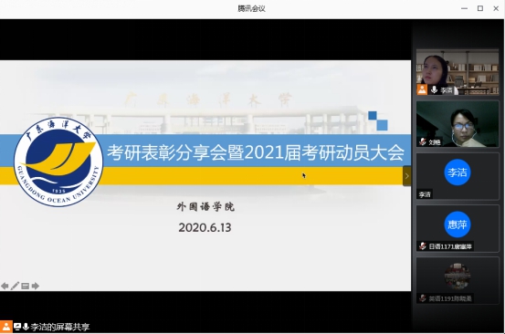 为表彰优秀考研学子,树立榜样典型,帮助下一届学生明确考研目标,坚定信心,6月13日晚上,WilliamHill威廉在腾讯会议室召开了考研表彰分享会暨2021届考研动员“云端会议”。 学院院长郭遂红,党委副书记刘艳、辅导员老师、学生代表共210多人出席了会议。