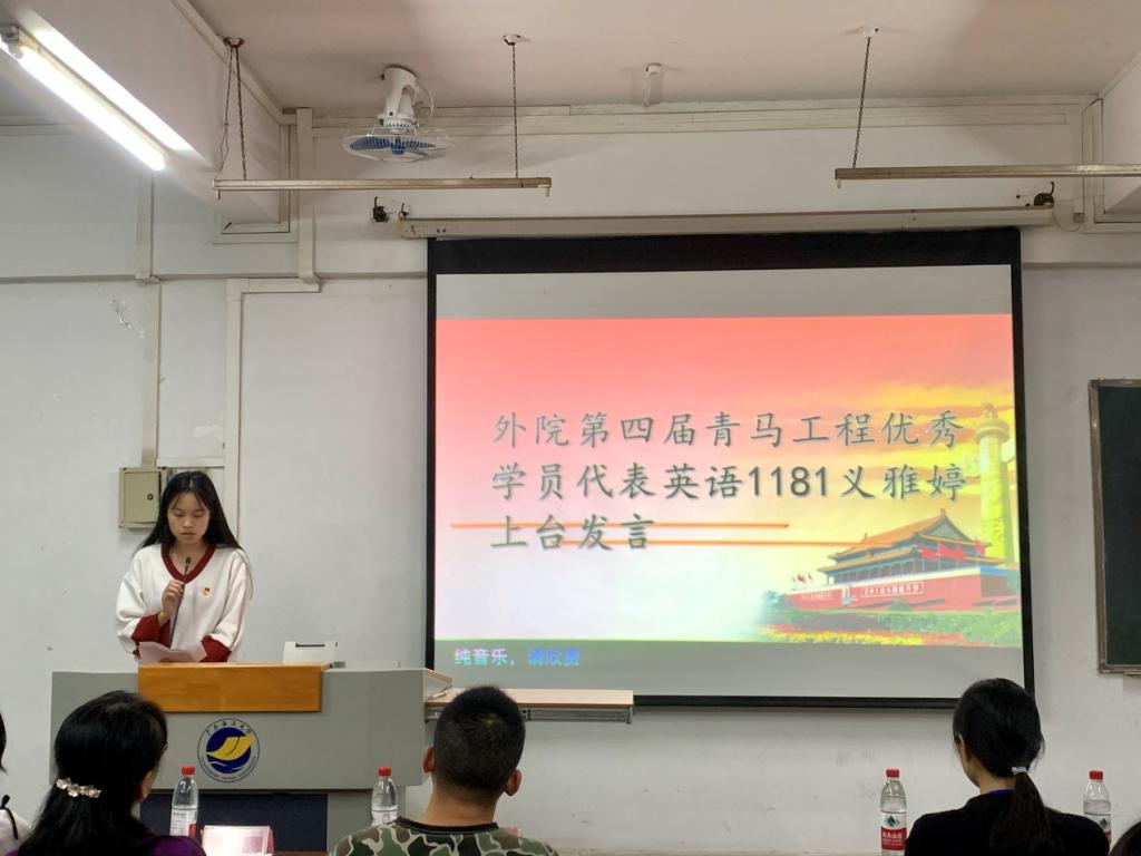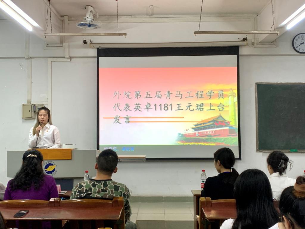 本次开班仪式共分为五项内容,分别是唱团歌、上届青马优秀学员代表发言、学员宣誓、嘉宾讲话、分组情况。首先,第四届“青马工程”优秀学员代表英语1181义雅婷发言,她分享了去年在青马班的学习生活与切身感受,作为青马人不仅铸造了青马魂,而且也对马克思及其理论要有了更深入的认识;即着重自身发展,也要着眼国内外形势;第五届“青马工程”学员代表英卓1181王元珺向我们分享了她对“青马工程”的理解,以及呼吁学员们不仅需要拥有一个健康的体魄,也需要拥有崇高的理想和较强的能力,青马正是提高理论水平的大舞台。然后,刘艳副教授指出:开展“青马工程”对提高我院学生骨干的思想政治素质、政策理论水平、创新实践能力和组织协调能力是非常有帮助的,通过教育培训和实践锻炼等行之有效的方式,也是进一步坚定跟党走中国特色社会主义道路的信念,成长为中国特色社会主义事业的合格建设者和可靠接班人有效途径。