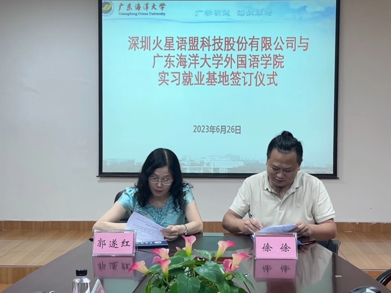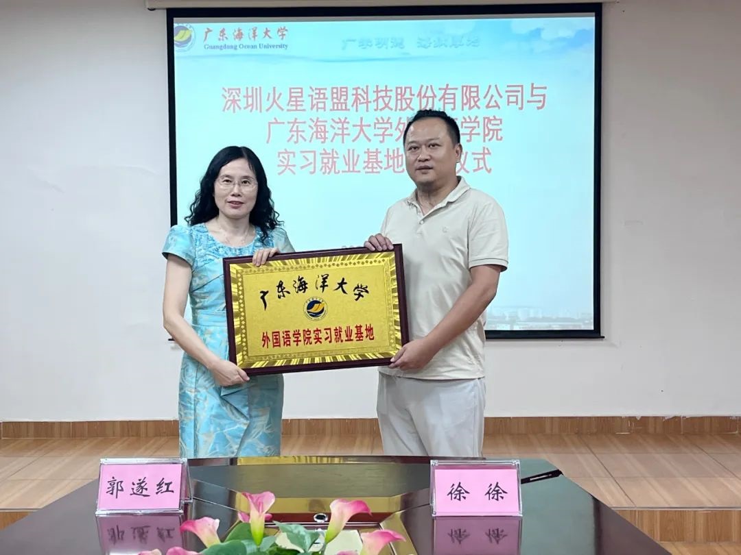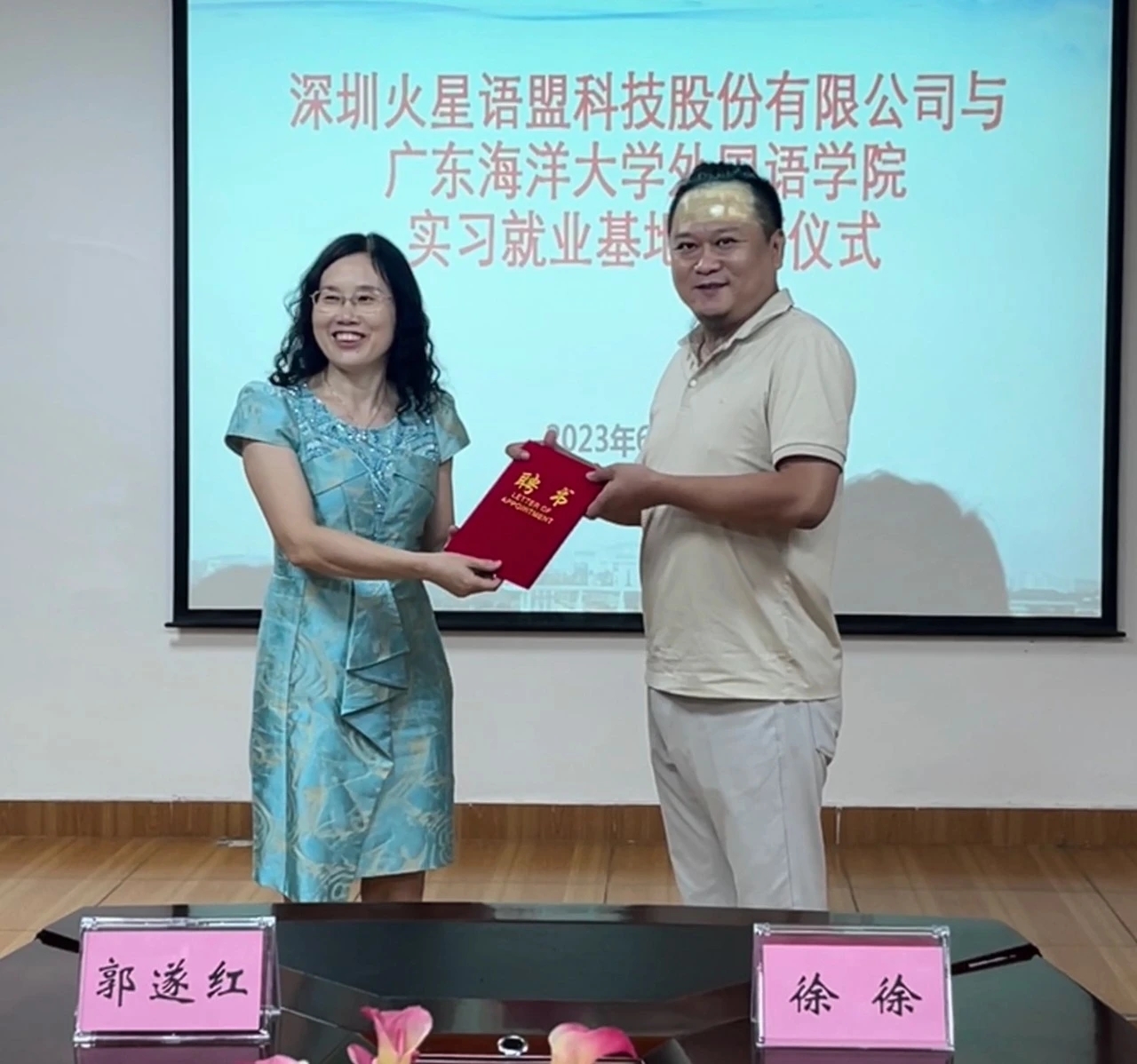 6月26日,在湖光校区兴教楼105,WilliamHill威廉举办深圳火星语盟科技股份有限公司实习基地签约授牌仪式。学院正处级辅导员、学院党委副书记刘艳主持仪式。学院院长郭遂红、副院长何谦卫、副院长安丰科、学院党政办主任黄海文、日语系主任张乐乐、英语系主任毛妙维及火星语盟副总裁徐徐、火星语盟华南区校企负责人陈嘉瑜出席。