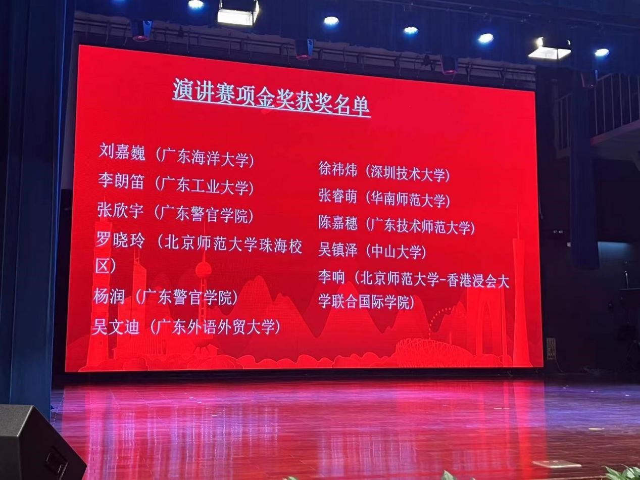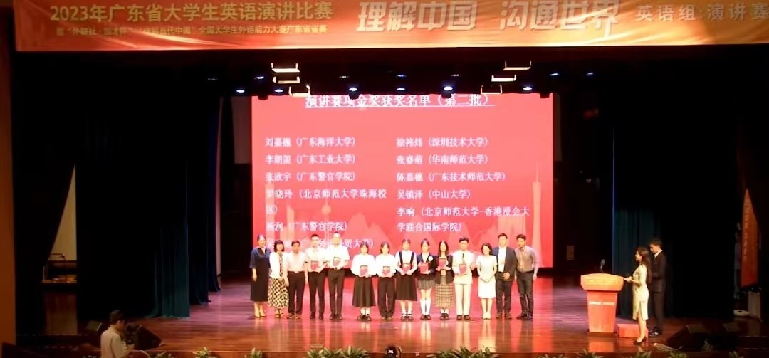 2023年广东省大学生英语演讲比赛暨“外研社·国才杯”“理解当代中国”全国大学生外语能力大赛广东省省赛于 2023 年11月4日至11月5日在北京师范大学-香港浸会大学联合国际学院成功举行,我校选手取得优异成绩。