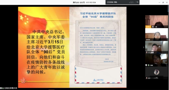 学院党委副书记刘艳为支部党员同志讲授《让青春在党和人民最需要的地方绽放绚丽之花》的主题党课。刘艳首先与大家分享了习近平总书记给北京大学援鄂医疗队全体“90后”党员的回信,并以疫情防控期间全国各地义无反顾地逆行而上援助湖北的白衣天使们的可歌可泣的感人事例以及我校学子主动承担抗疫一线志愿服务工作的生动案例,展现了海大青年对国家和民族的责任担当。她对支部的学生党员提出两点希望:一是希望学生党员深刻领会习近平总书记回信中对青年的热切期望,利用大好青春时光、利用自身专业特长,用有限的能力投身到无限的为人民服务中;二是新时代的青年党员要时刻起到模范带头作用,在国家困难时要坚决挺身而出,牢记初心使命,将青春和热血奉献给国家。